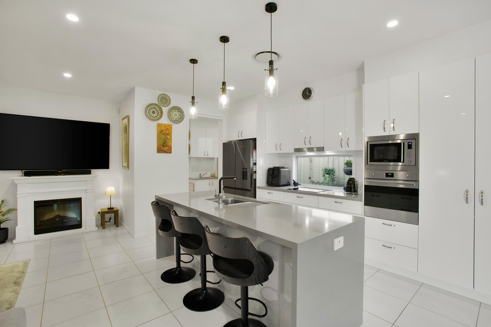 – Contemporary kitchen featuring an island bench, abundant storage, and quality Smeg appliances.