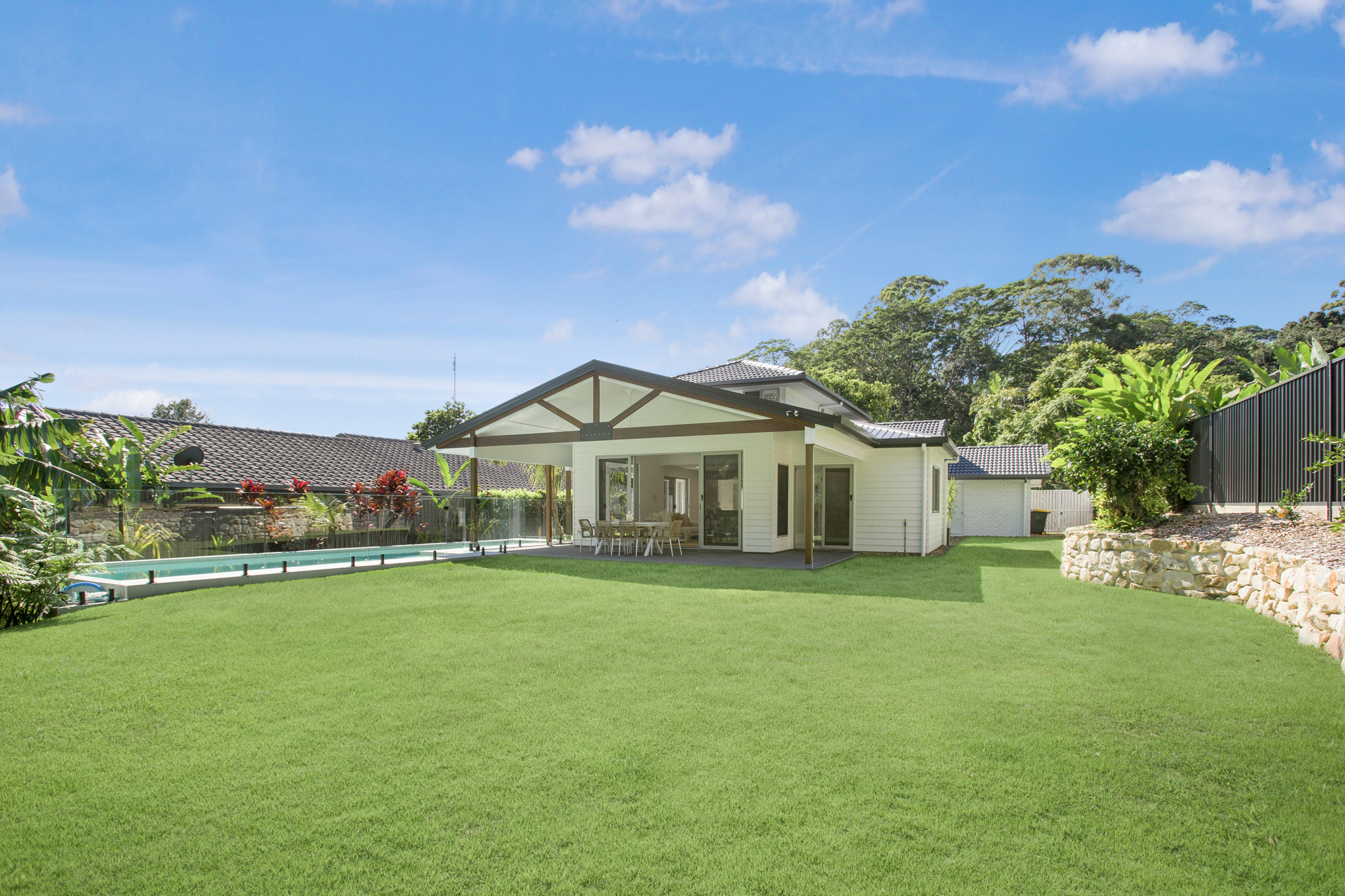 – The outdoor setting is private and immersive, with a covered outdoor entertaining area extending to a 12-metre lap pool, generous lawn, and a serene bushland backdrop.