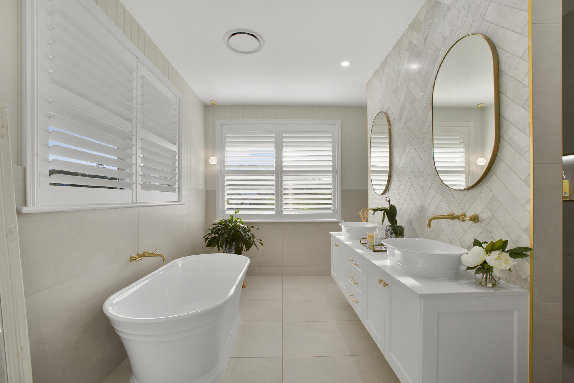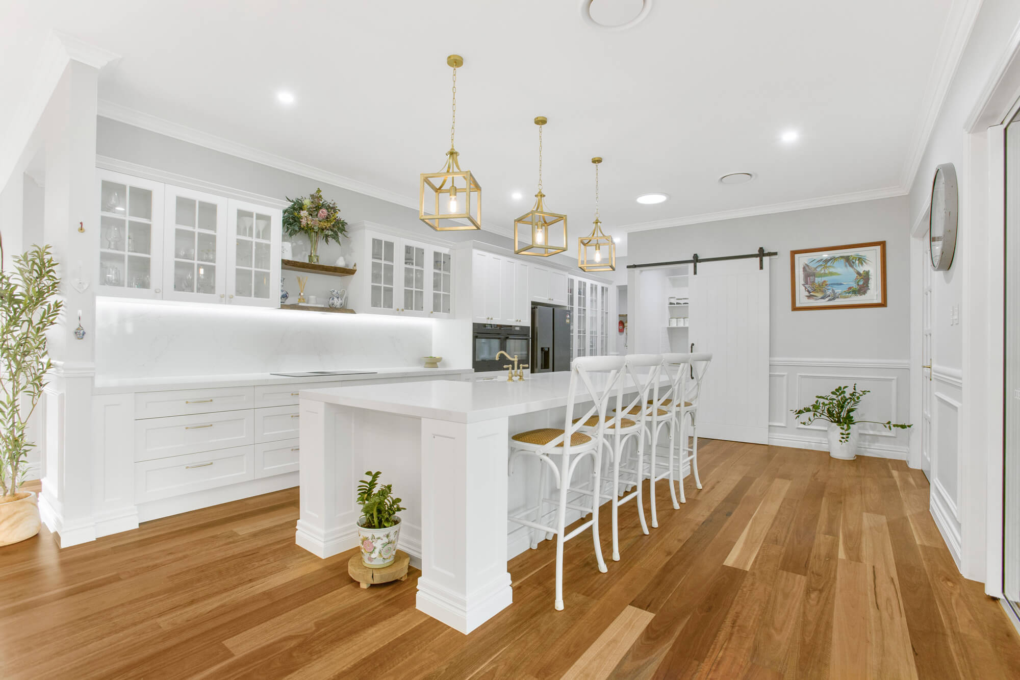 – The Hamptons-inspired kitchen is a chef’s dream with stone benchtops, an AEG induction combo hub with downdraft, double ovens, an extraordinary butler’s pantry providing unmatched storage and functionality.