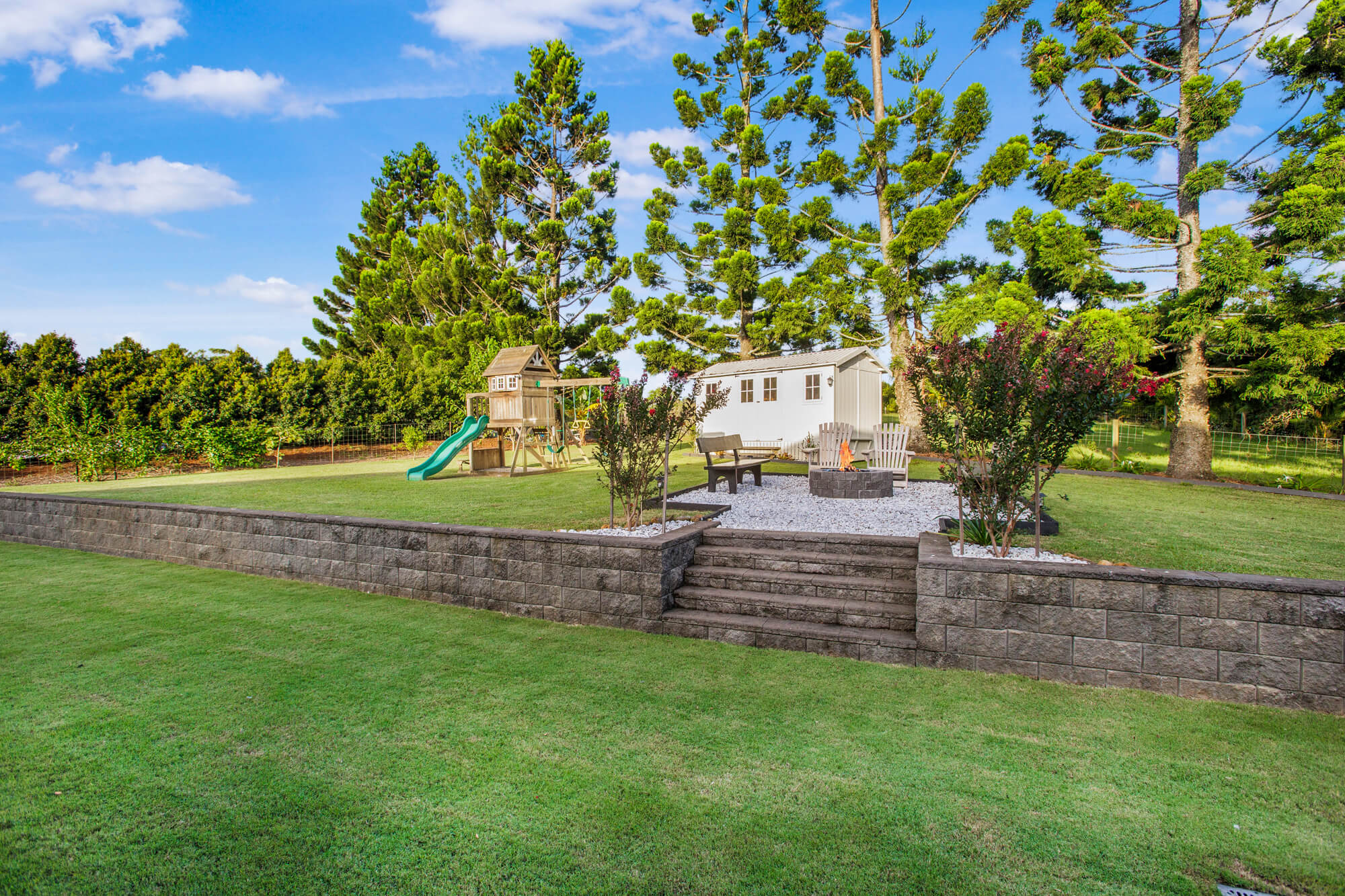 – Expansive living areas boast soaring 3m ceilings, bespoke spotted gum engineered floors, anchored by a striking British-style Inglenook fireplace that radiates warmth, character, and timeless charm.