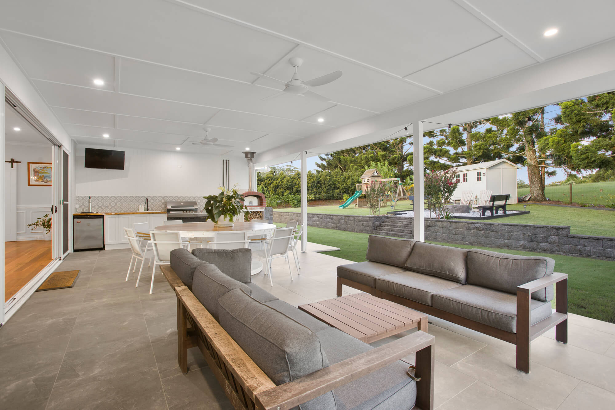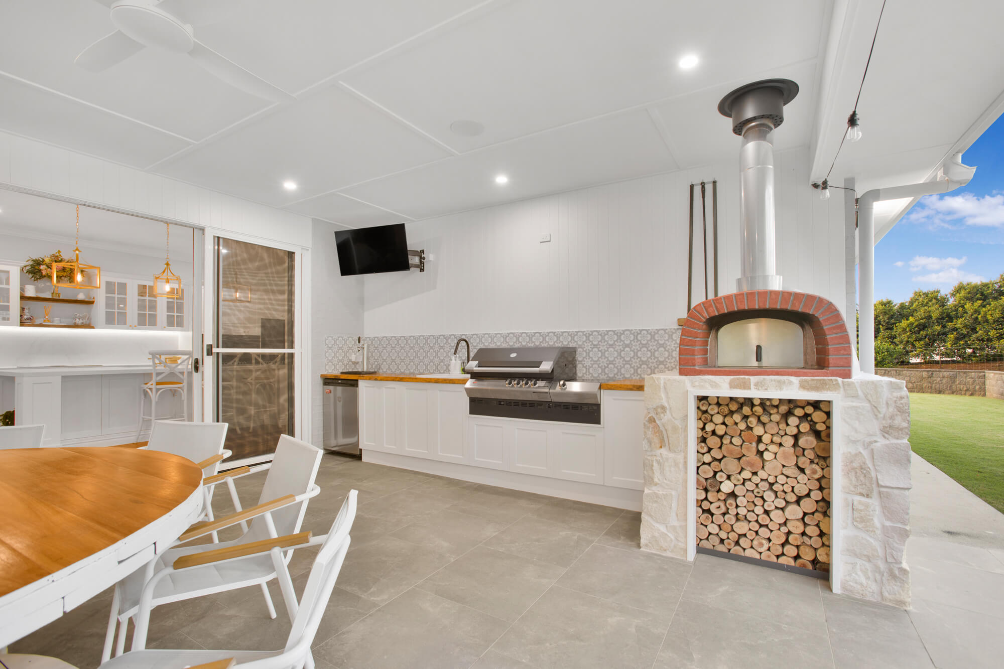 – The covered outdoor entertaining area is exceptionally appointed, complete with a fully equipped kitchen, built-in BBQ, pizza oven, sink, TV and outdoor Bluetooth speakers, overlooking a sparkling 15m lap pool and a bespoke firepit area.