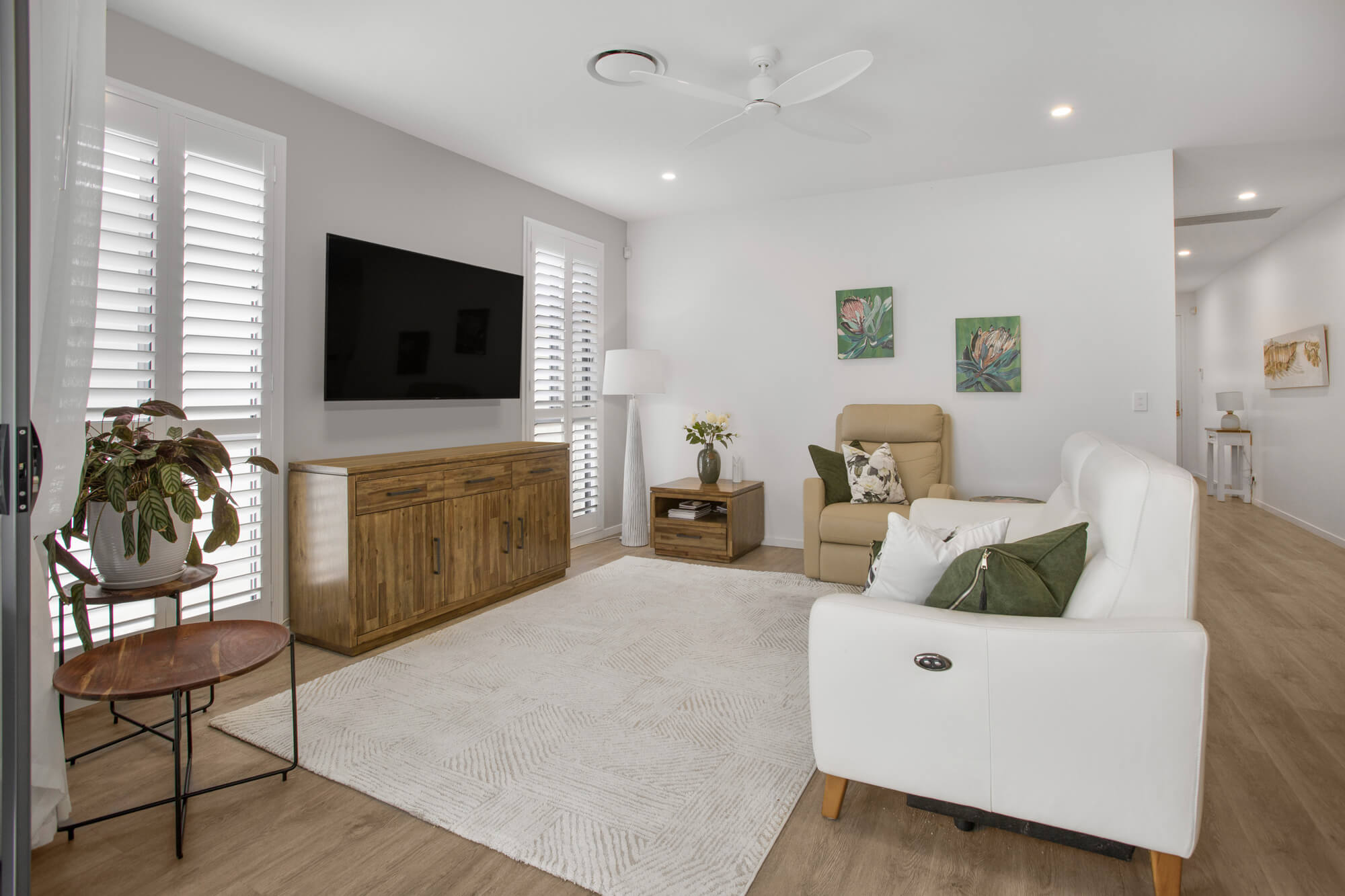 – Secure double car accommodation with epoxy flooring, ducted air-conditioning, and plantation shutters throughout.