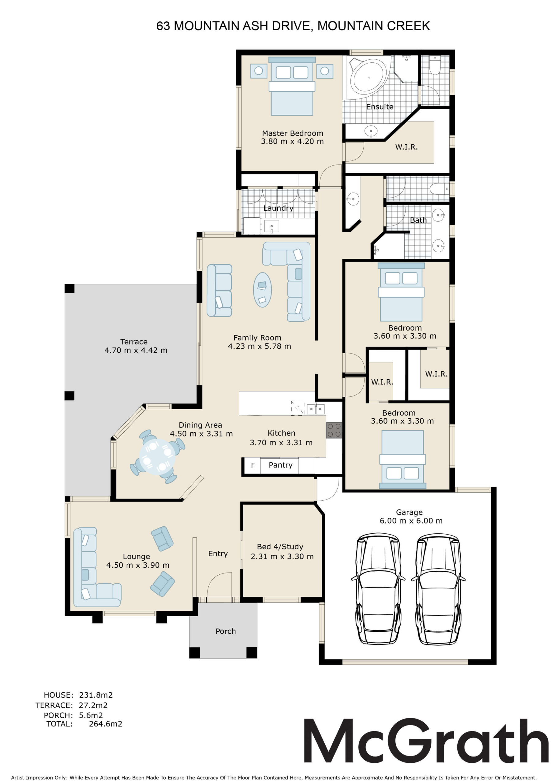 – Secure double car accommodation with internal access, ducted air-conditioning and ceiling fans throughout.